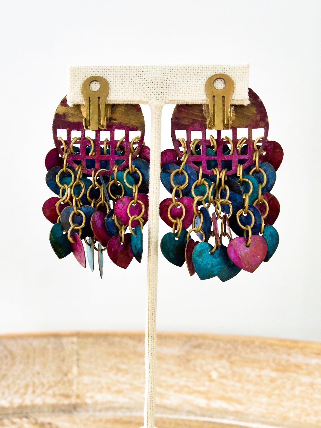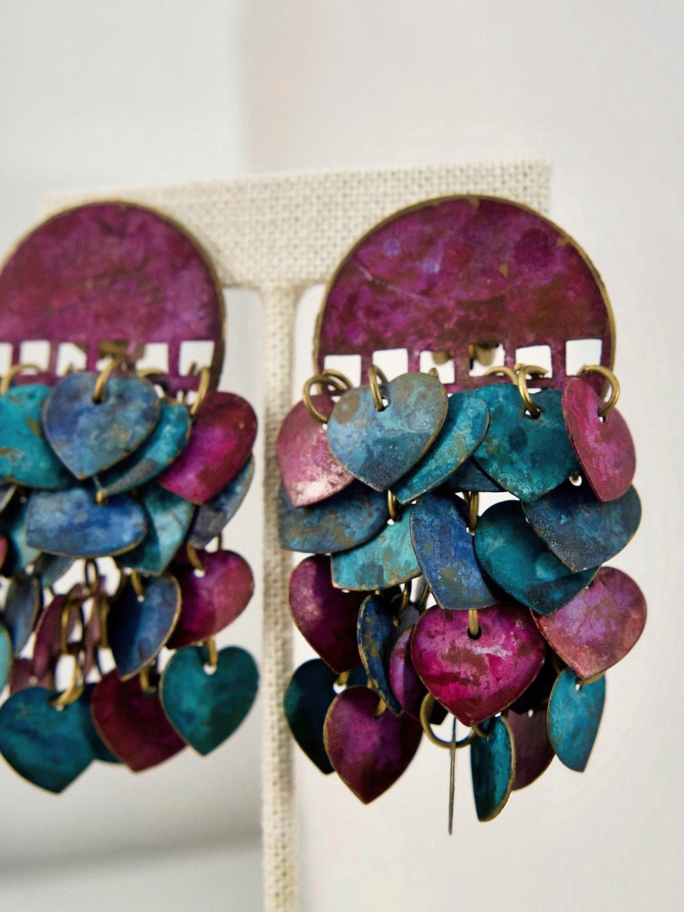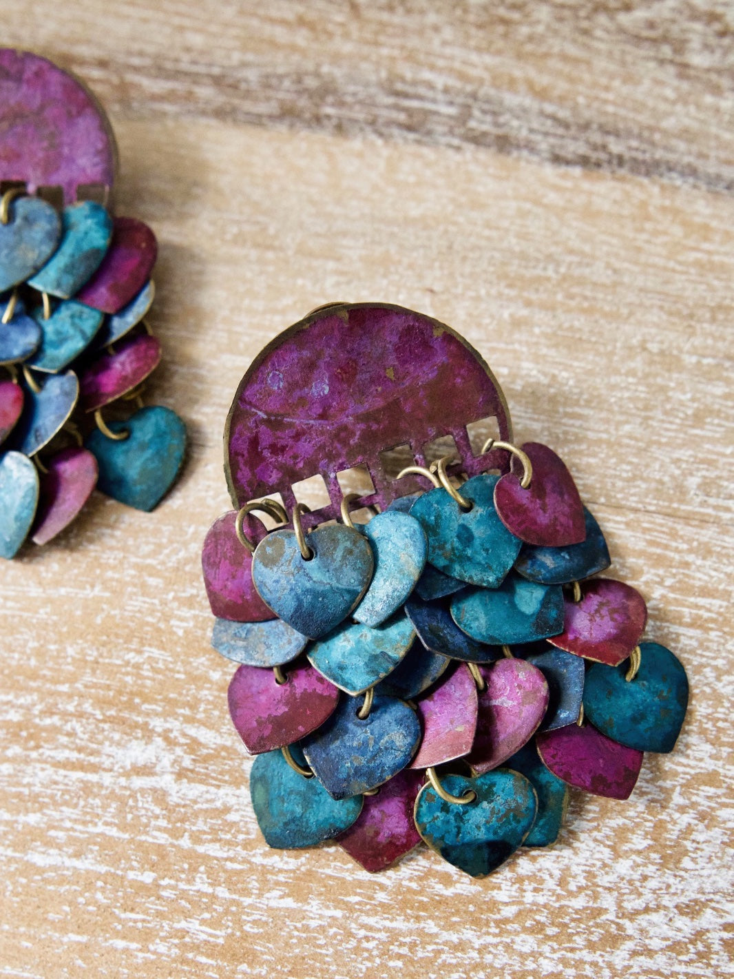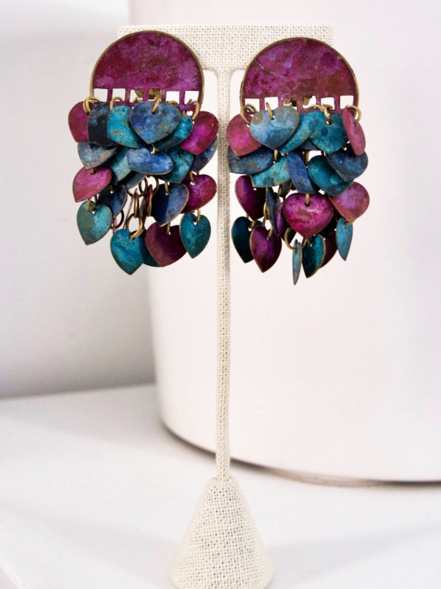 Vintage 80's earrings. Handmade of solid brass. So fun and unique. Painted patina hearts charms, each hand connected by a single loop. These amazing earrings dangle and dance as they move.