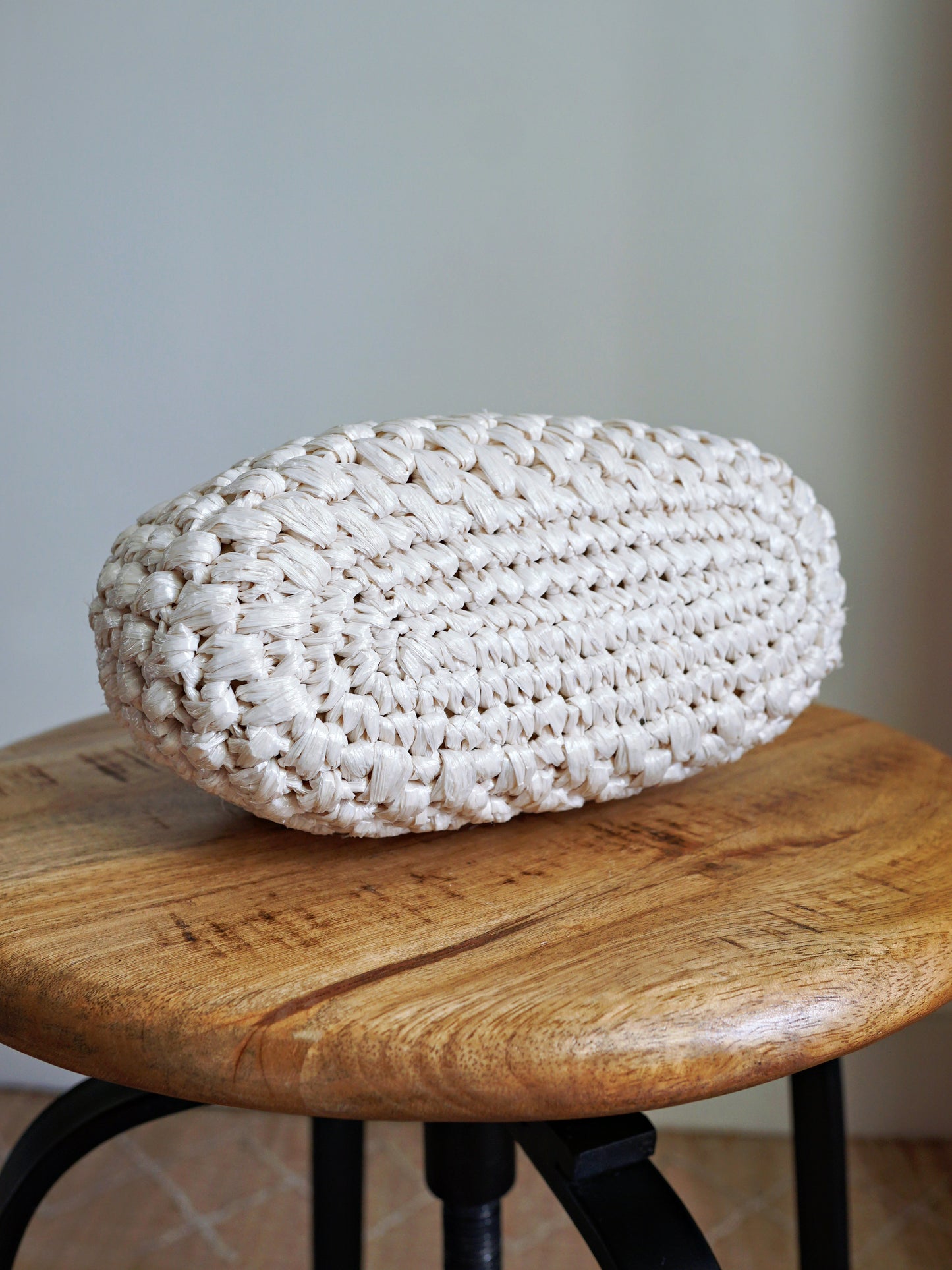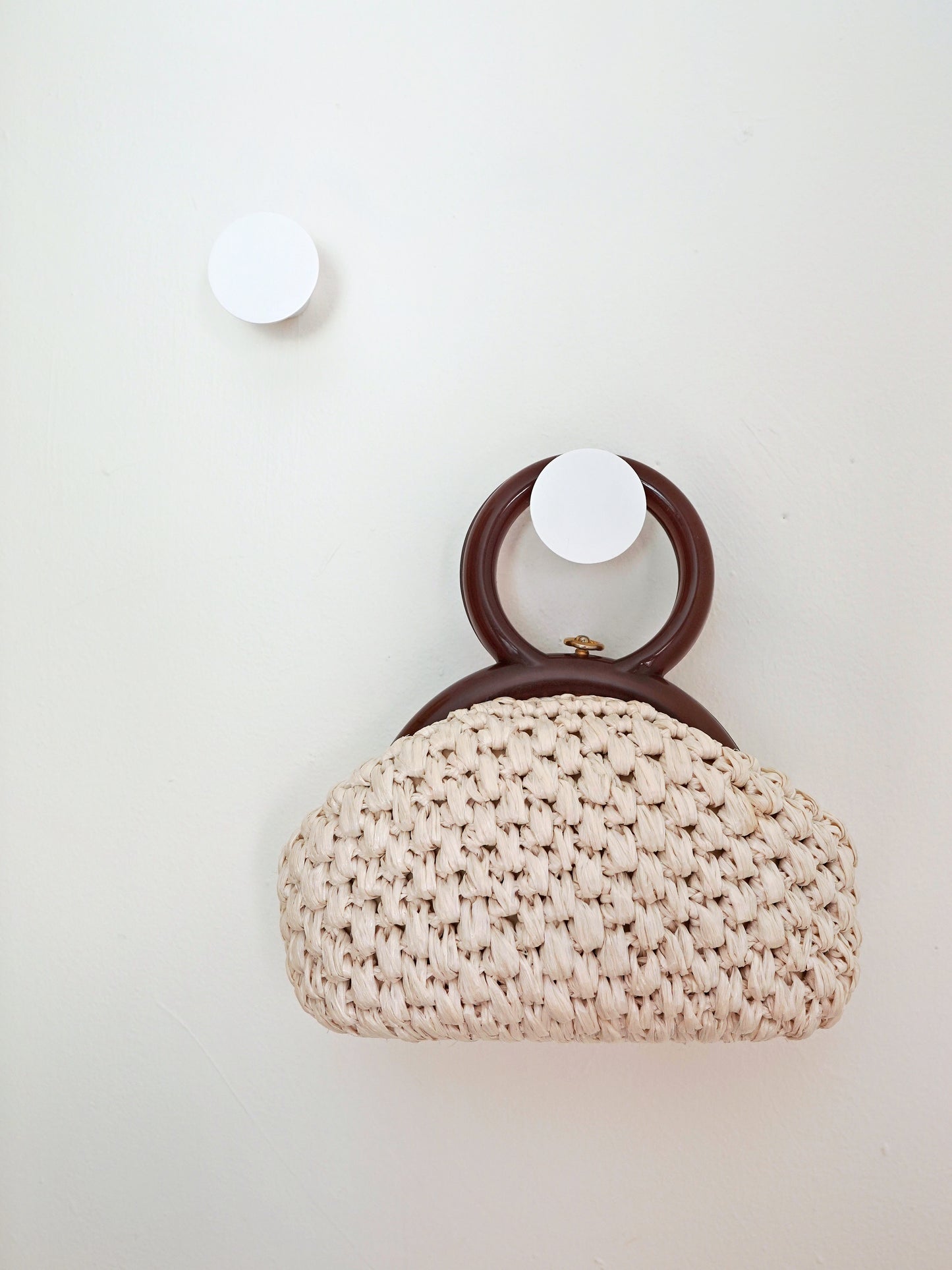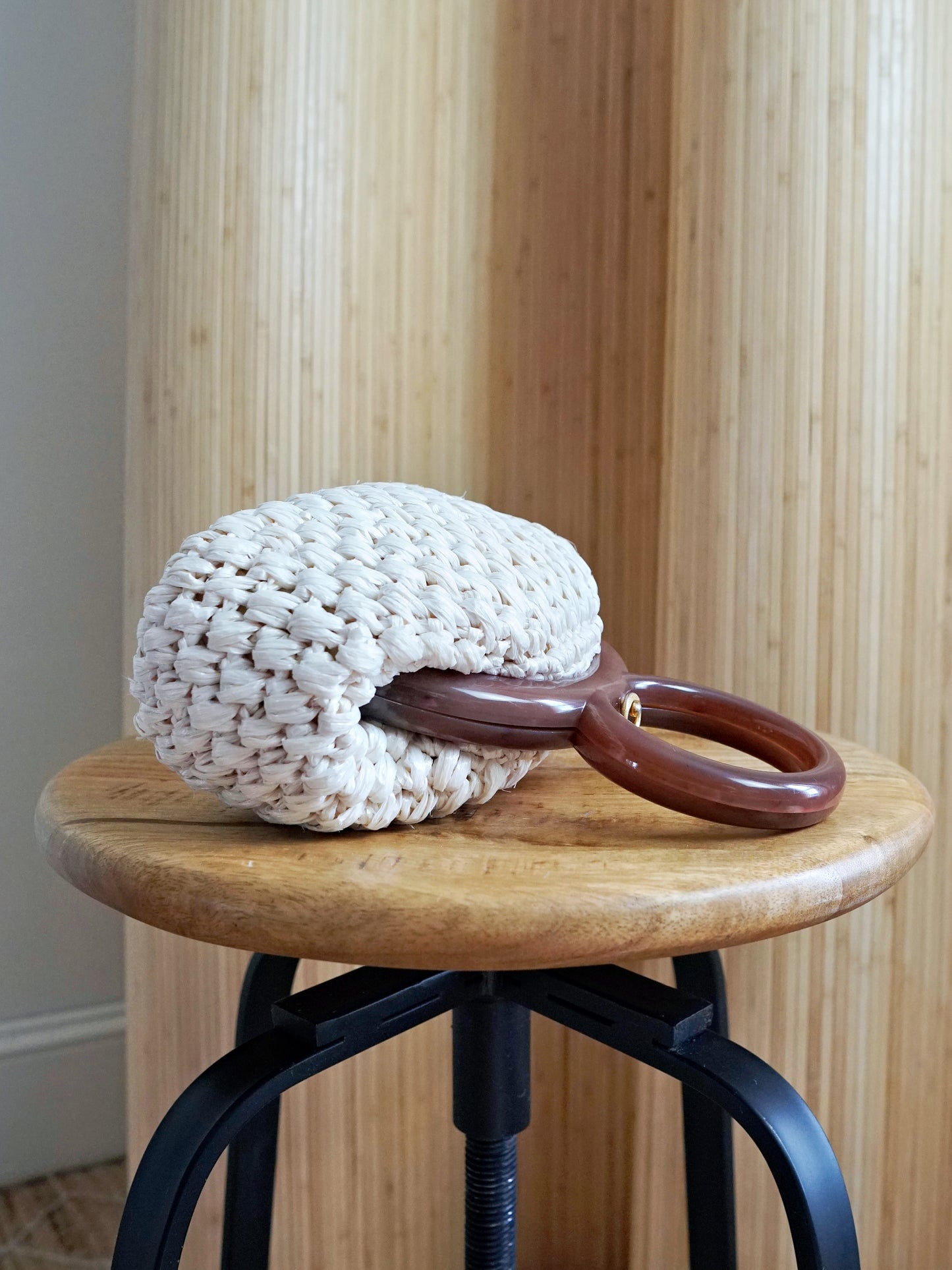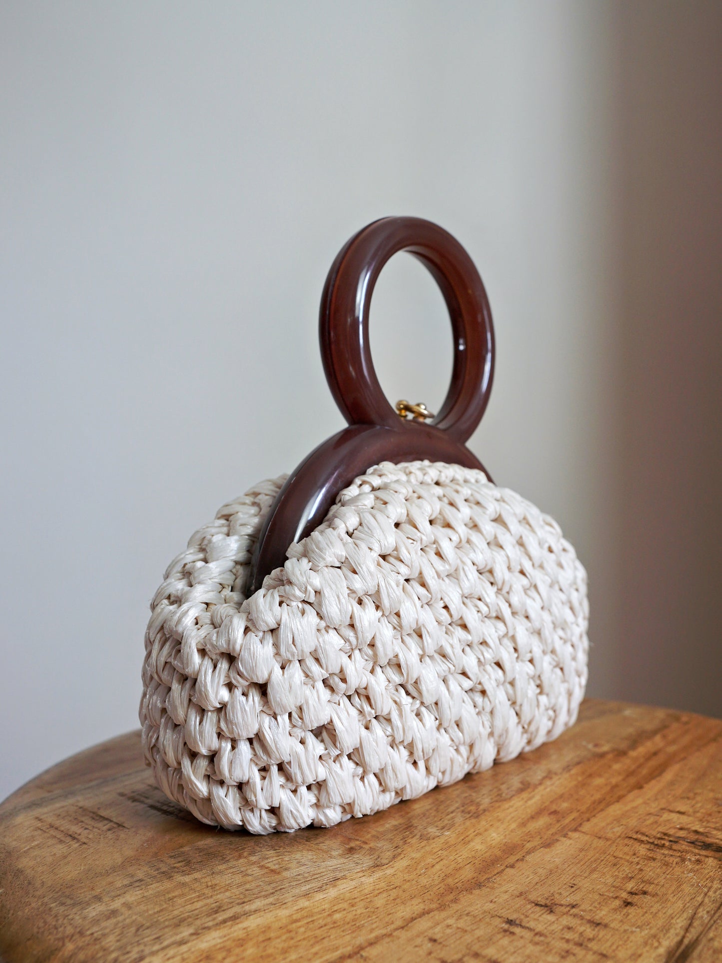 Vintage 60's bag. Textured natural raffia in creamy vanilla. Glossy lucite circular handle. Golden metal door knock closure. Fully lined. Made in Italy.
