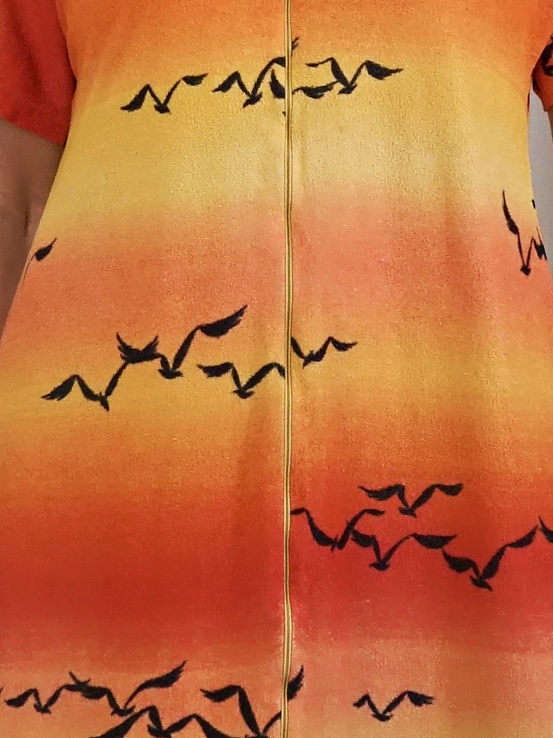 Vintage 70’s dress. Sunset glow in a warm, gradient palette and tropical horizon. Palm trees and birds across the hem like a painted memory. Maxi length with a deep v-neckline, soft drape, and an easy silhouette that moves with you. Front zipper. Single, right pocket. Feels like vacation after dark, effortless and bold.