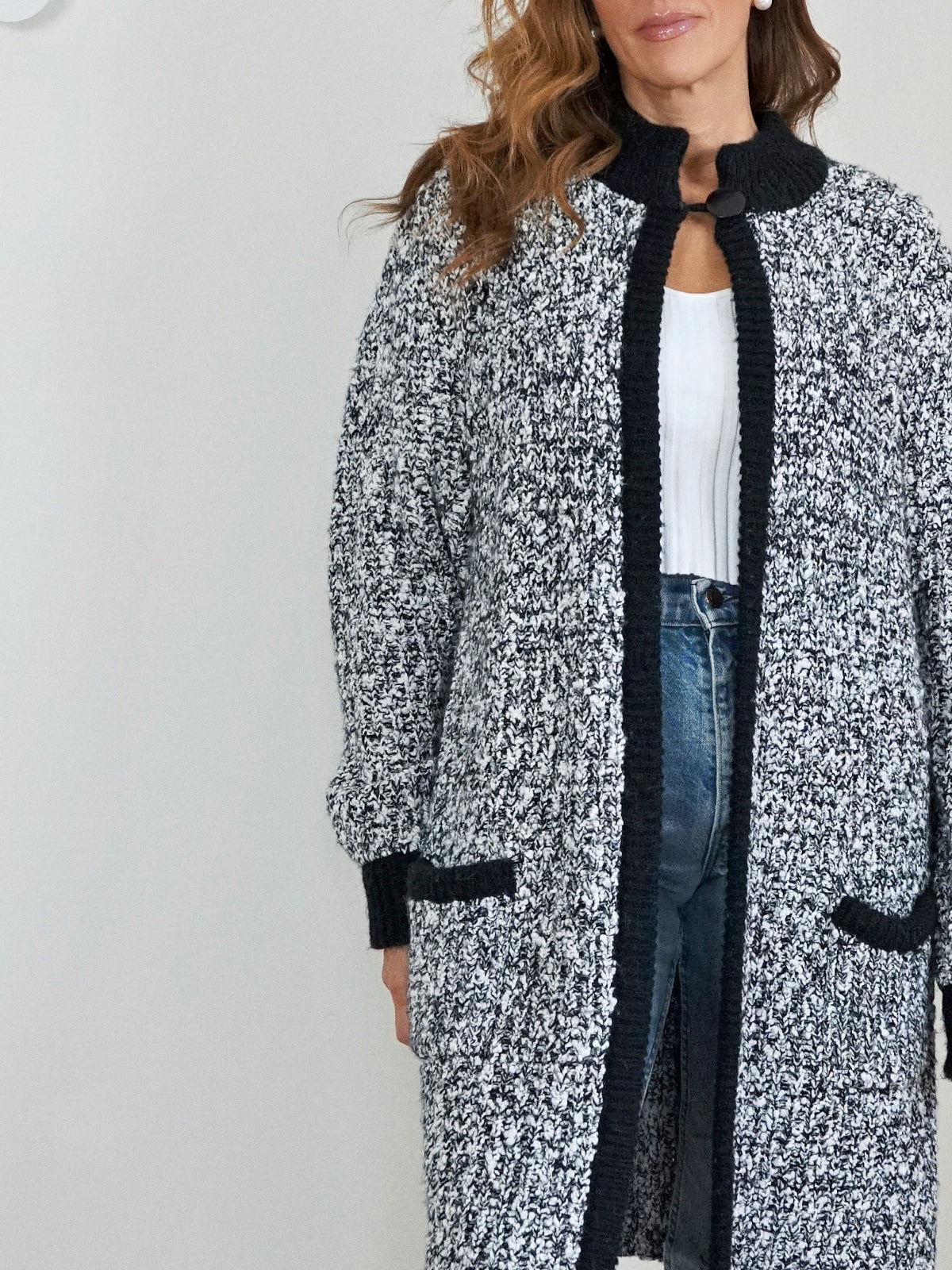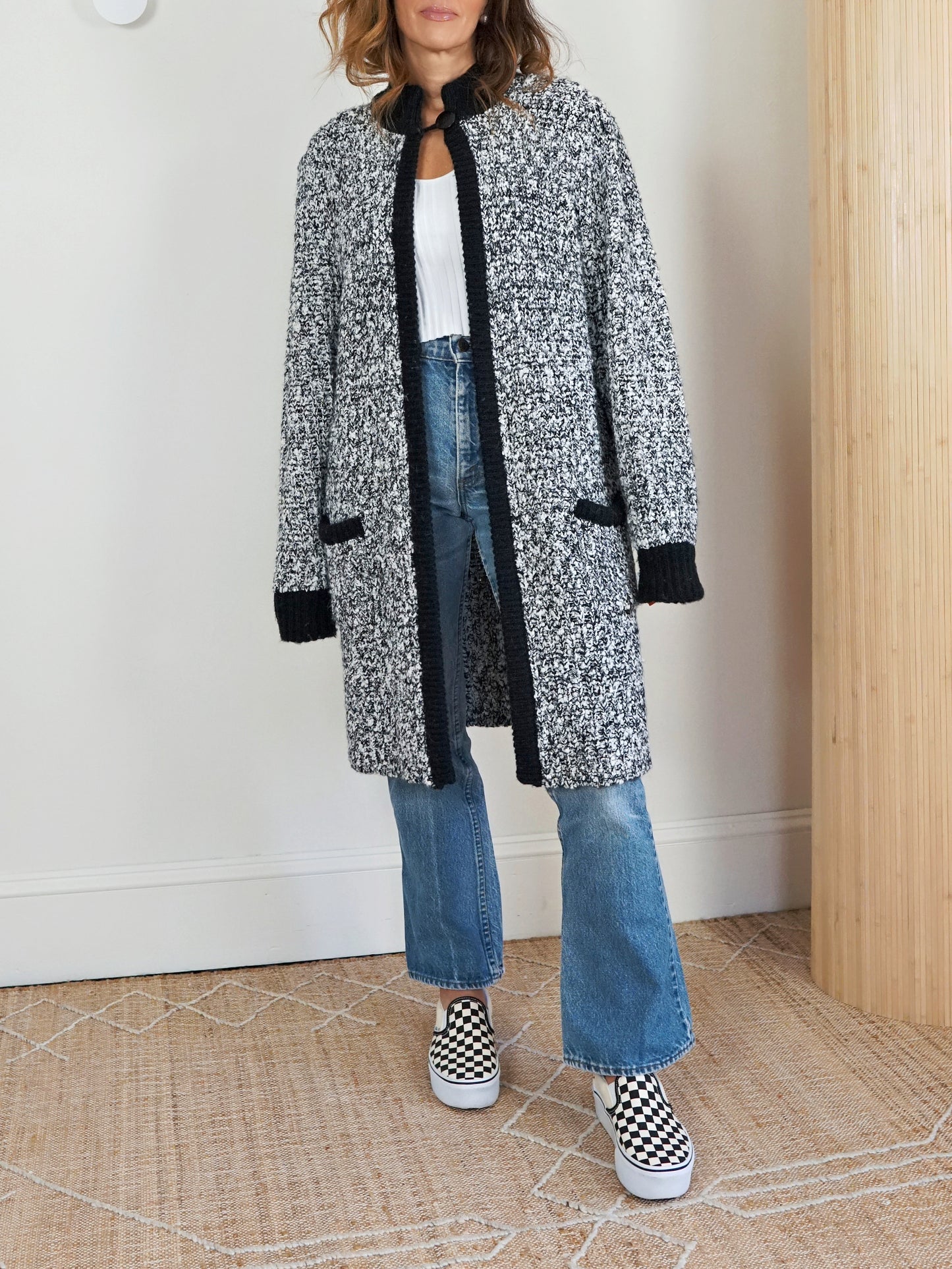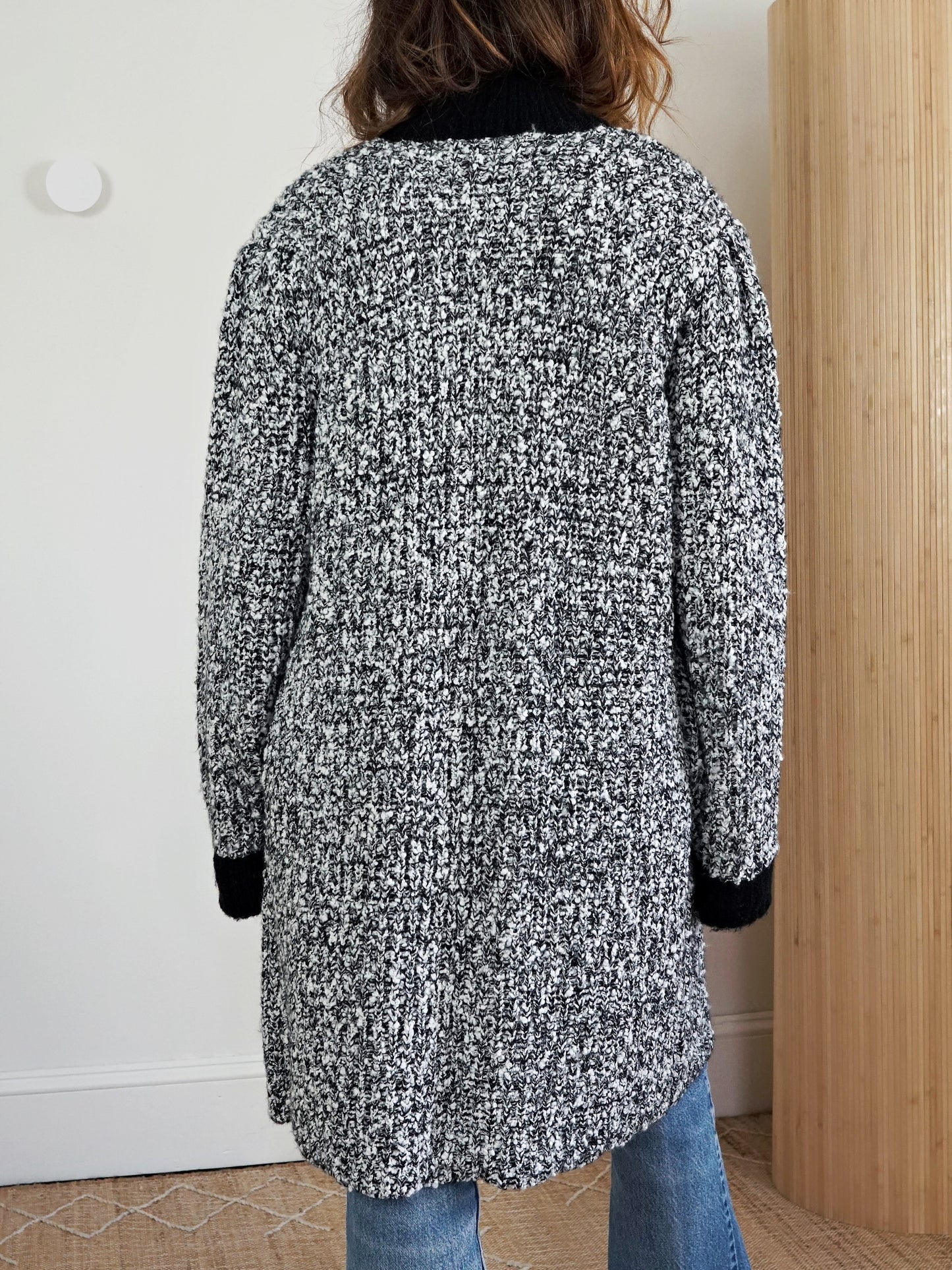 Vintage 80's sweater. Textured marl knit with a sharp contrast trim. Cardigan style in a longline shape. Open front with a single button closure on neck. Patch pockets. Soft feel and structure.An easy layer with presence.. simple, warm and made to live in.