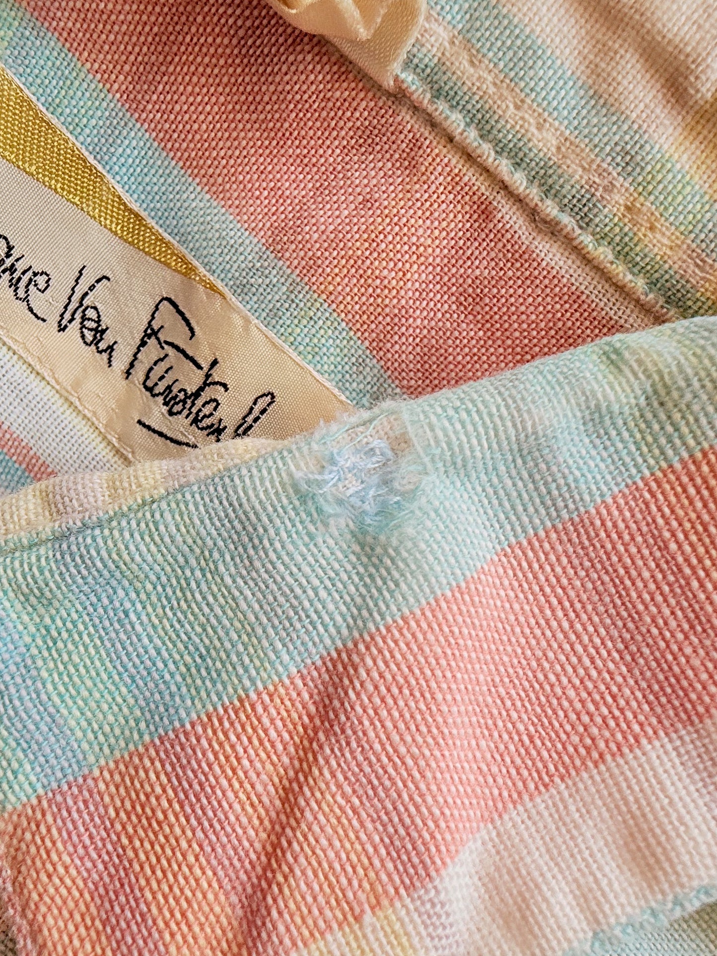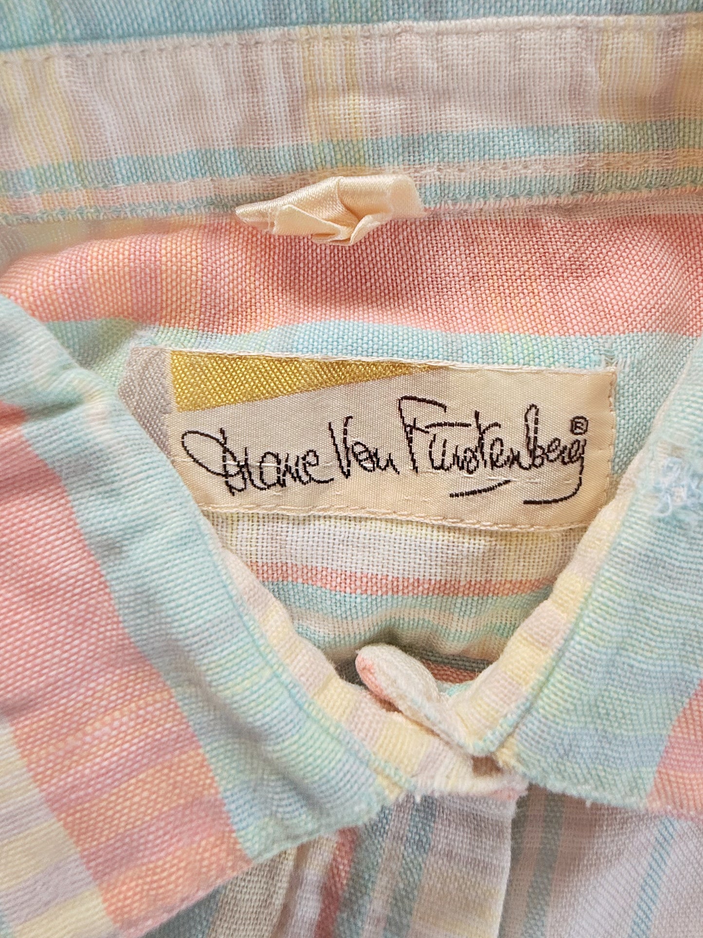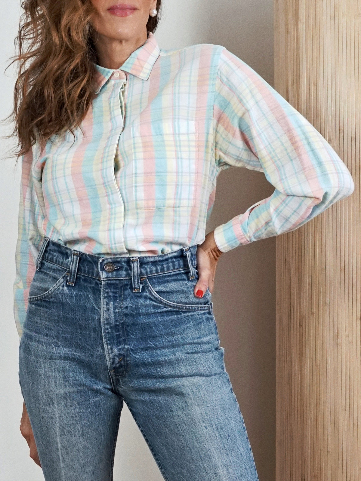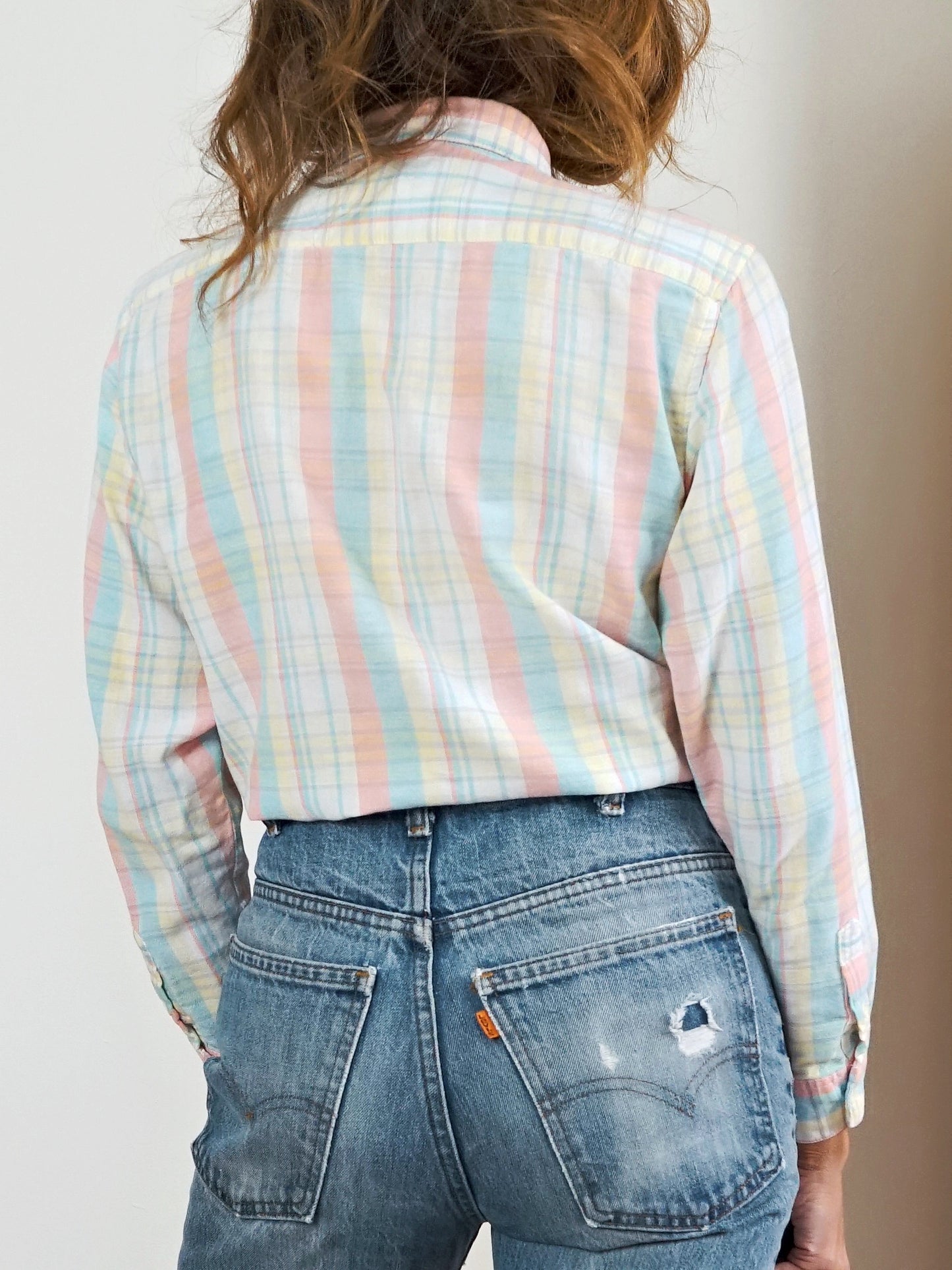 Vintage 80's shirt. Super soft and worn-in cotton in a sunwashed pastel plaid. Button front. Long sleeves with buttons on wrist. Single chest pocket. Shirttail hem.