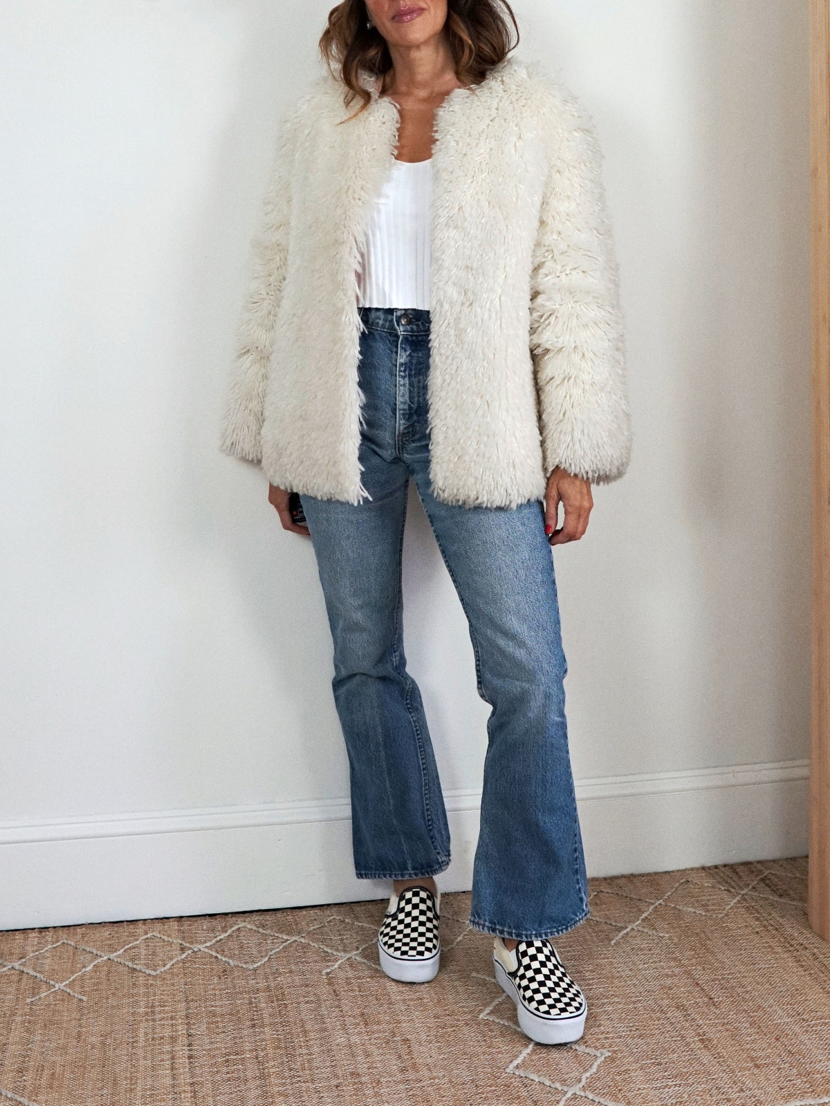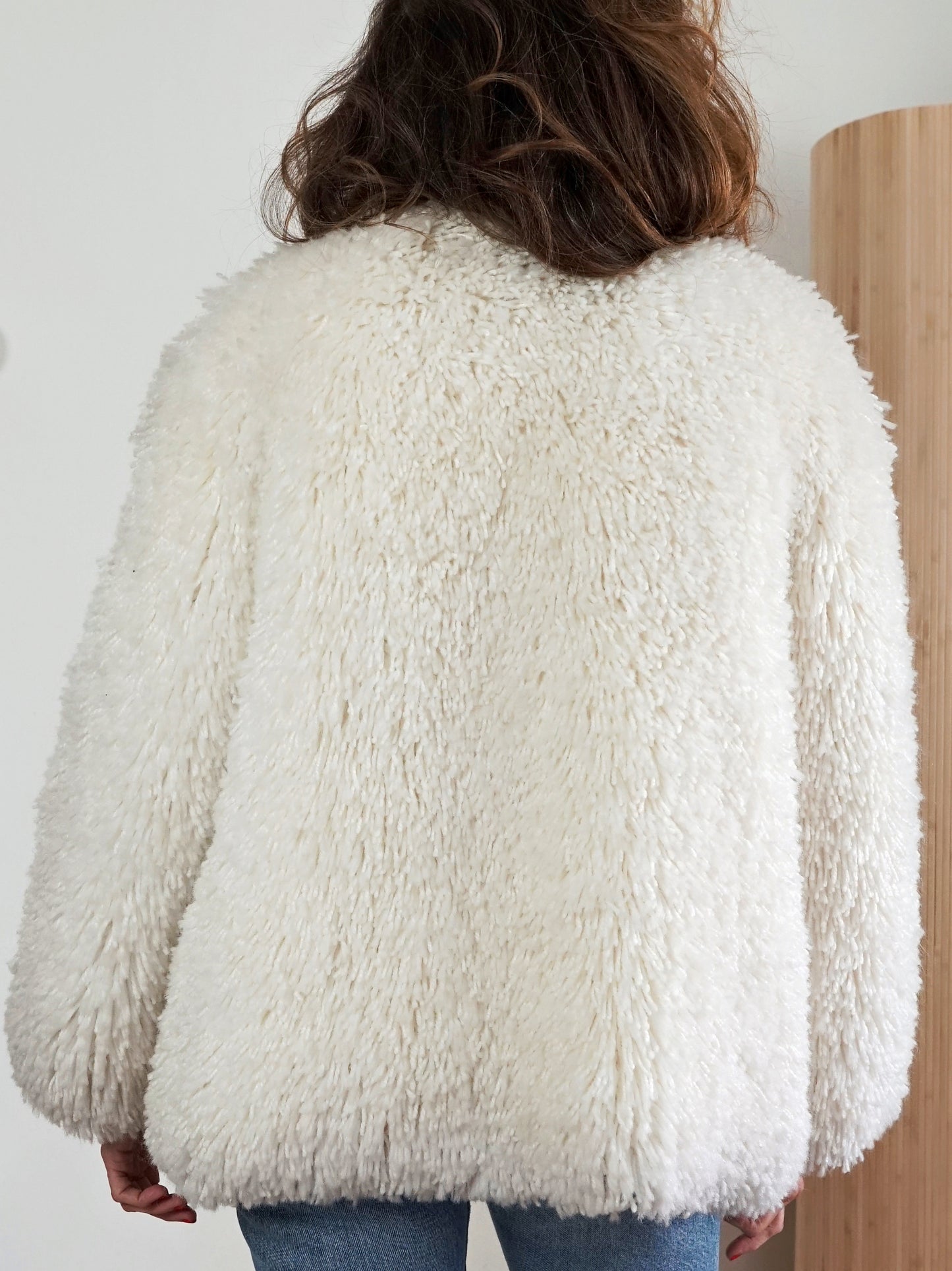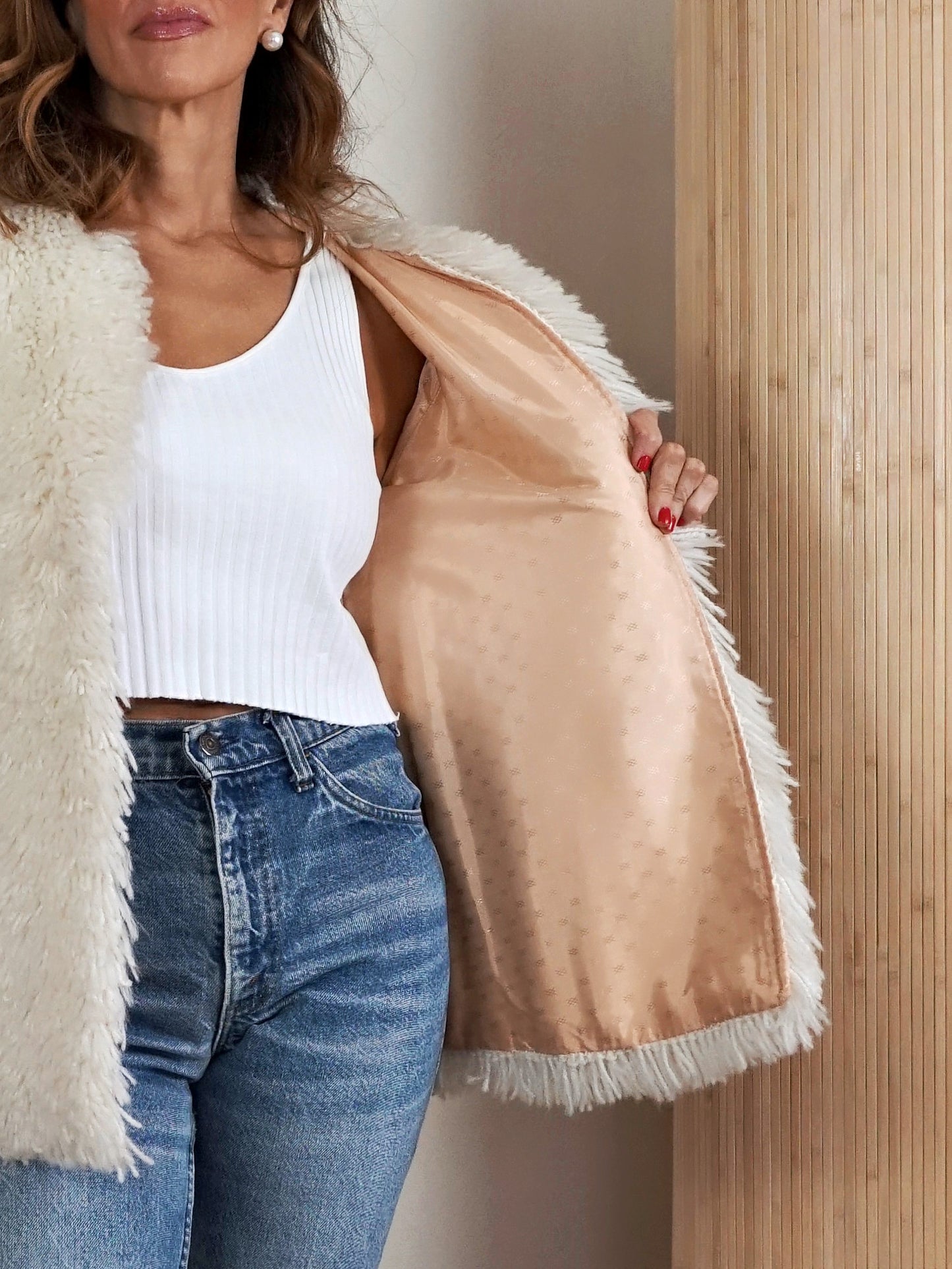 Regular price $ 284.00Vintage 70's jacket. Creamy vanilla and super cozy. Entirely handmade from a fluffy, shag rug. Amazing fit, simply drapes over the body. No buttons or closures. Drop shoulder. Long sleeves. Fully lined in luxe, peach satin.
