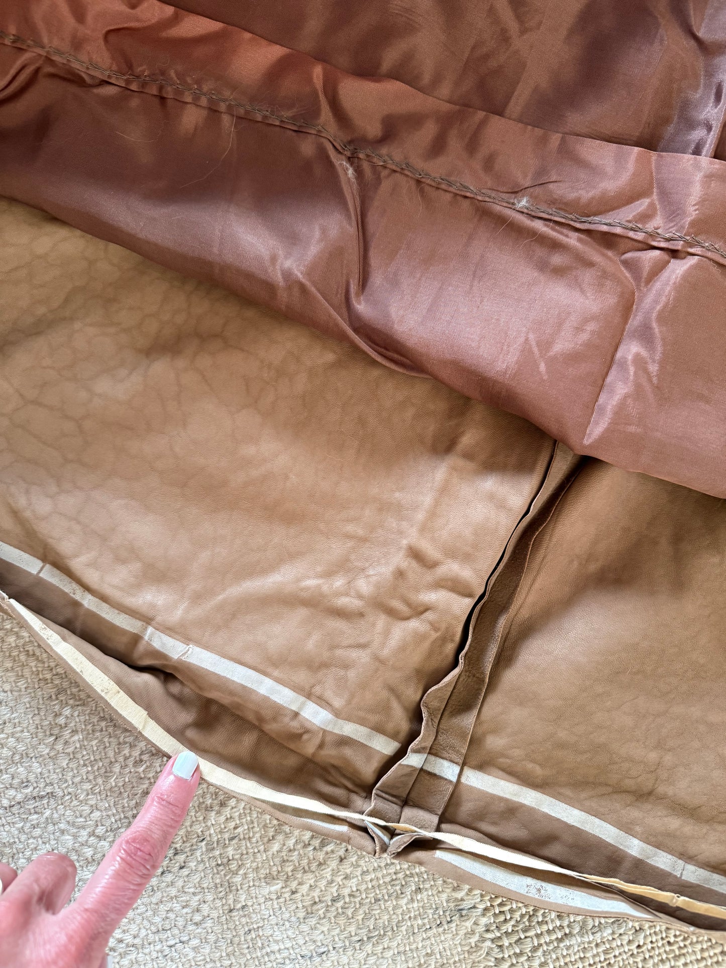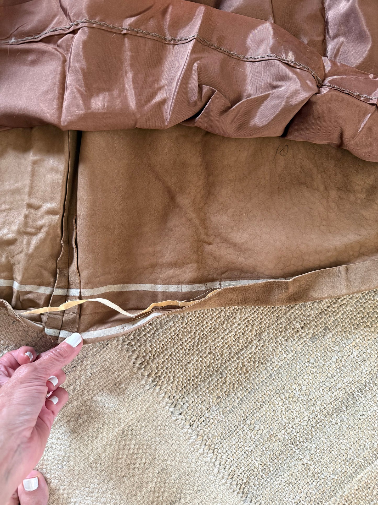 Regular price $ 74.00Vintage 60's coat. Made of super buttery soft, coffee colored suede. Trimmed in a fluffy, genuine fox fur collar with hook and eye details so it can be worn fully closed around the neck to keep the chill out. Single breasted style in an a-line shape, with suede covered buttons and three quarter length sleeves. Belted waist wraps around front. Side, slit pockets. Fully lined.