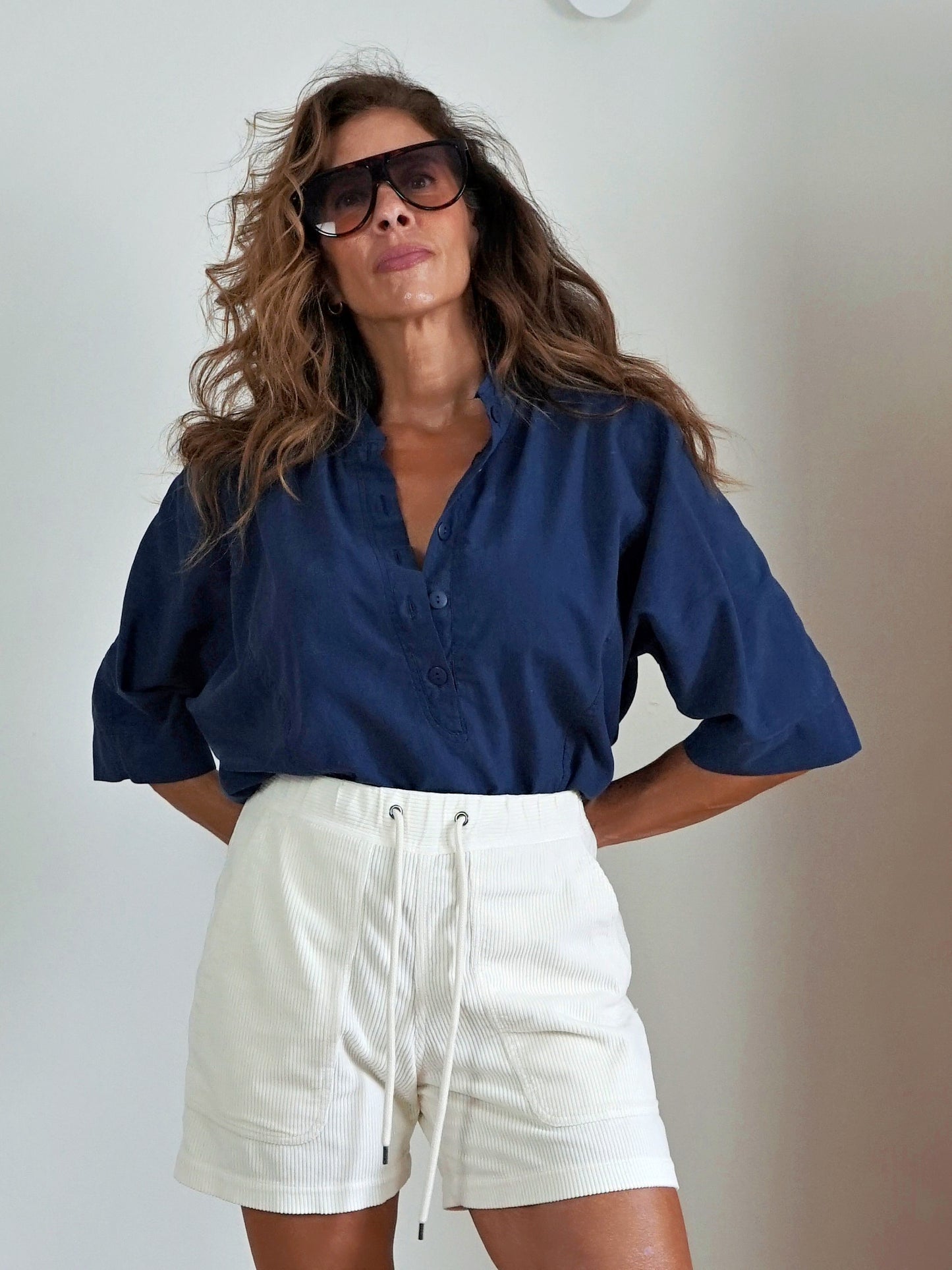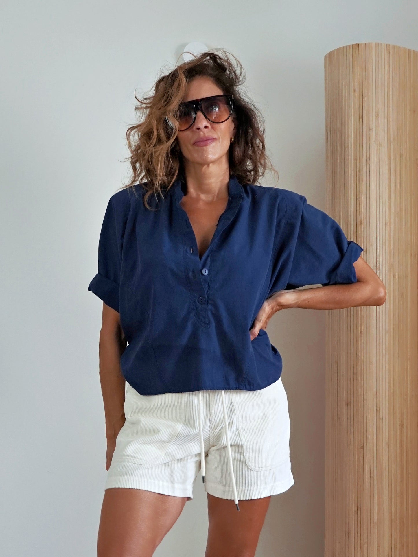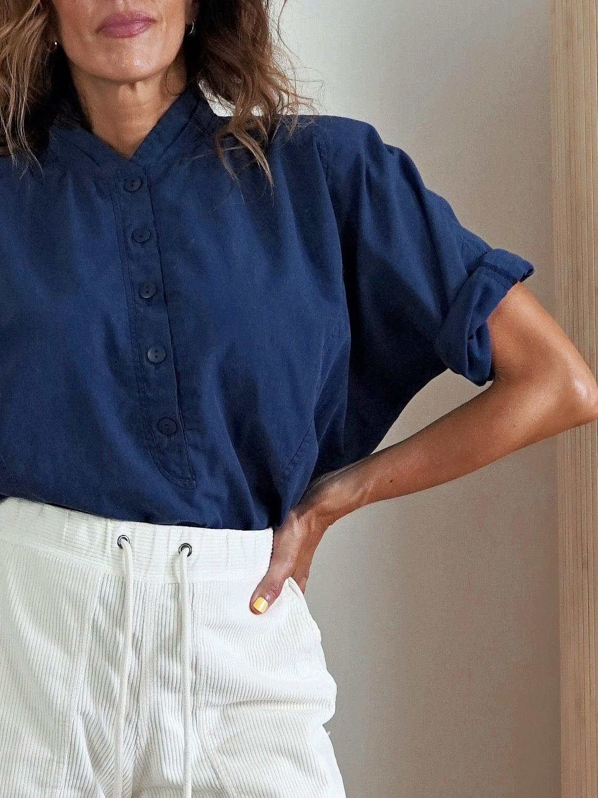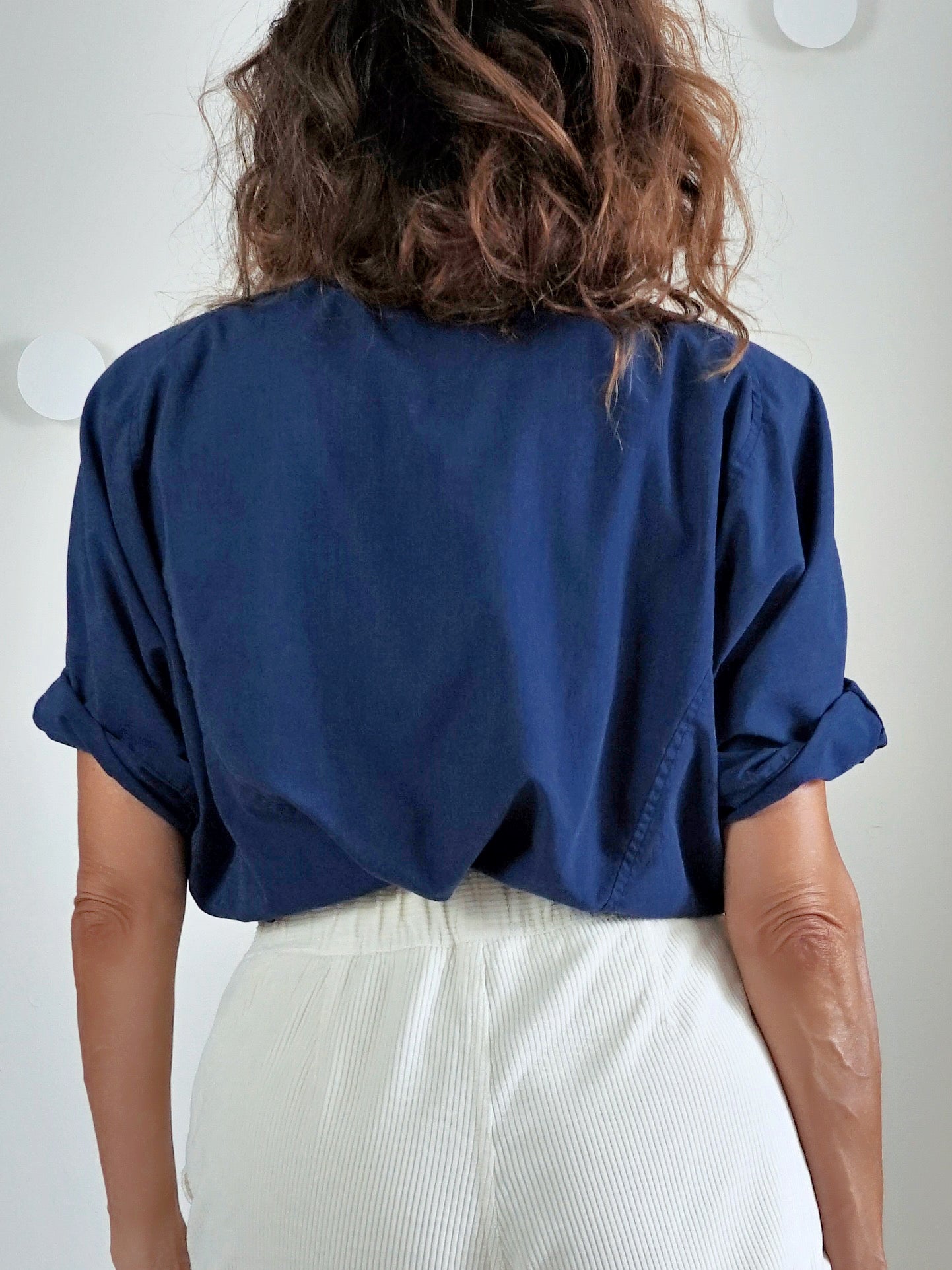Vintage 80's top. Navy blue in a batwing silhouette with bold lines and a relaxed drape. Button front, dropped (lightly padded) shoulders and a wide, cropped cut that moves withe ease. The kind of piece that shifts from casual to statement in a cool yet effortless way.